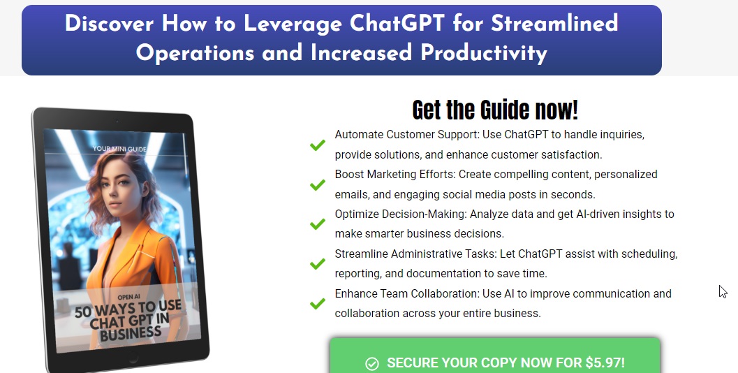 By promoting 50 Ways to Use ChatGPT in Business, you’re offering your audience an invaluable tool for boosting efficiency while earning great commissions.